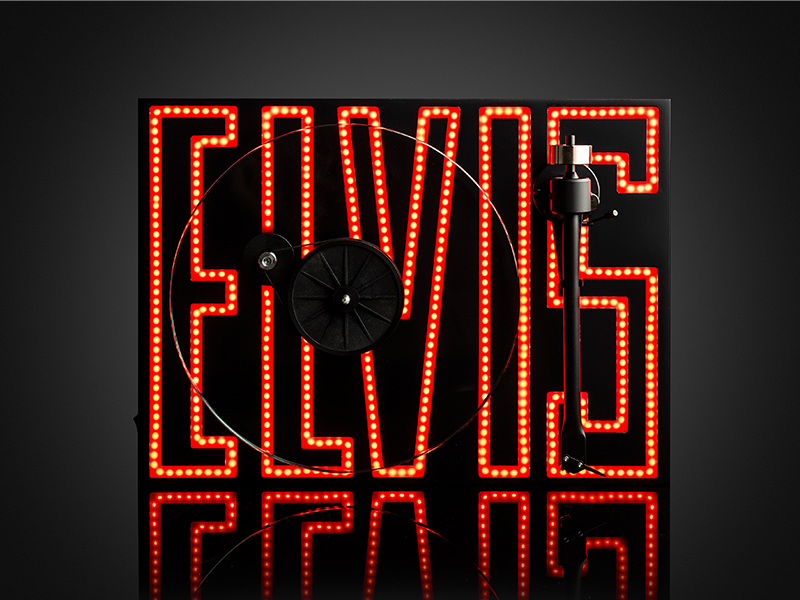 這台 Elvis 90 週年限量紀念唱盤,玻璃轉盤旋轉之際,LED 光芒映照出 Elvis 的名字。